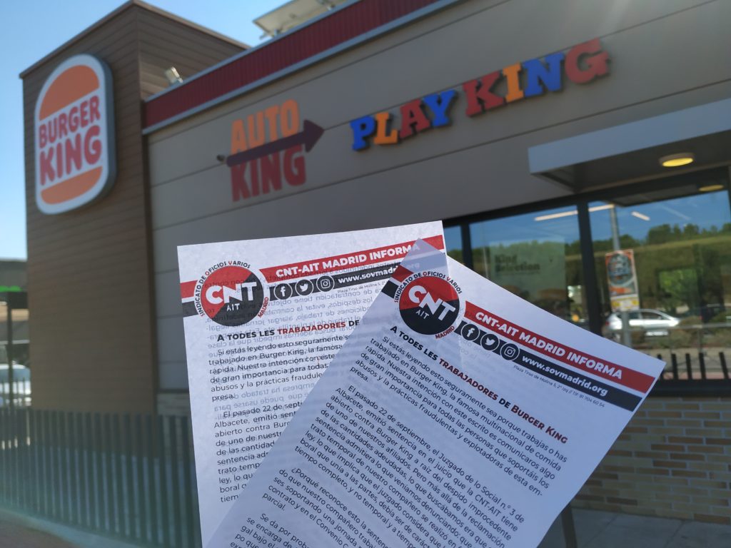La semana pasada, en el marco de la Semana de Lucha Internacional contra el Impago de Salarios convocada por la AIT, varios grupos de la Federación Local de la CNT-AIT visitaron 7 establecimientos de Burger King para informar a les trabajadors de la sentencia que el Juzgado nº3 de lo social de Albacete emitió el pasado 22 de septiembre en el juicio que el sindicato de esa ciudad tiene abierto contra la multinacional.