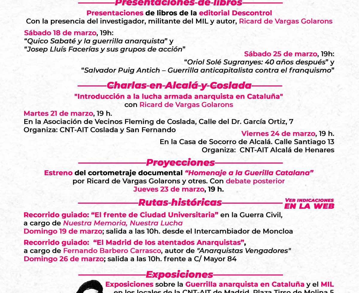Entre el 18 y el 26 de Marzo, la CNT-AIT de Madrid, acogerá en sus locales históricos de la Plaza de Tirso de Molina 5, distintas actividades que girarán en torno a la Lucha Armada Anarquista, con la participación del investigador y militante Ricard de Vargas Golarons y la Editorial Descontrol.