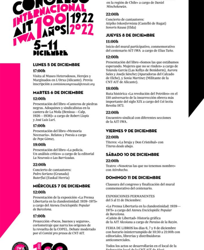 El encuentro de más de veinte delegaciones internacionales, de todas partes del globo, demostrando después de cien años de lucha, que el anarcosindicalismo, el internacionalismo y el Apoyo Mutuo de la Clase Obrera siguen más vivos y presentes que nunca.