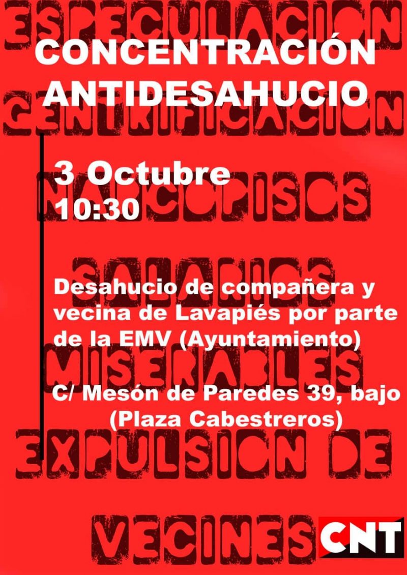 El 19 de octubre nos congregamos por segunda vez para evitar que el ayuntamiento de Madrid (Ahora Madrid) y EMV (Empresa Municipal de Vivienda) desahuciaran a nuestra compañera y vecina del barrio… Sigue leyendo...