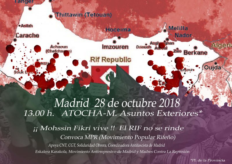MANIFESTACIÓN CONTRA LA REPRESIÓN AL PUEBLO RIFEÑO "Mohsin Fikri vive. El Rif no se rinde" Domingo 28 de octubre, a las 13 horas saldremos de Atocha hasta el Ministerio de Asuntos Exteriores… Sigue leyendo...