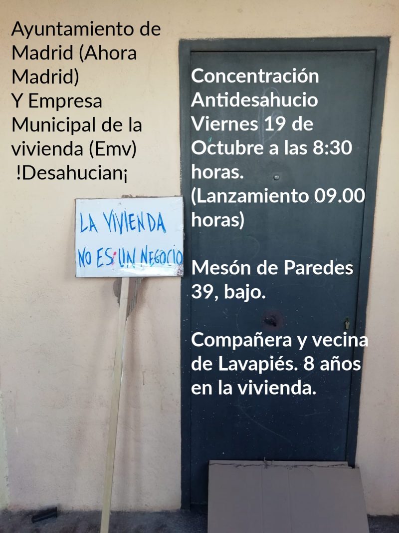 https://youtu.be/koLrwcTha6o (video adjunto)El pasado miércoles 8 de julio, se interrumpieron las fiestas de Lavapiés. Esto sucedía en la plaza Cabestreros (Nelson Mandela). El motivo era denunciar las estrategias anti derechos sociales de este Ayuntamiento de Madrid. Este año se suceden los desahucios por parte de la empresa municipal de la vivienda, familias de todo tipo se han visto en la calle. También individualides, como es el caso de la compañera Cristina, que vive en Mesón de paredes 39. Está pidiendo un alquiler social, que se le niega a pesar de los anuncios de Carmena de… Sigue leyendo...