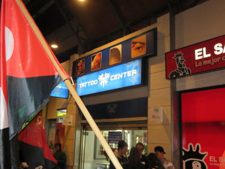 Aproximadamente sobre las siete de la tarde el piquete empezaba a desplegarse a las puertas del Tattoo Center Vaguada, con un claro objetivo. Permanecer todo el tiempo posible dentro del centro comercial, algo que cómo ya esperábamos la empresa no nos iba a poner nada fácil. El primer aviso por parte del encargado de tienda fue al personal de seguridad del propio centro, al que indico con palabras textuales, que actuaran con contundencia y nos sacaran de allí, cosa que cómo era de esperar no sucedió. Así a lo largo de todo el del piquete, tuvimos que entablar dialogo con la seguridad privada del centro, la policía municipal y la policía nacional, los cuales si pidieron identificarse por medio de D.N.I. a un compañero. Añadir que todas estas conversaciones fuerón normales y correctas y que causaron la contrariedad del encargado de Tattoo Center, ya que el desalojo del piquete que tanto ansiaba, no se produjo en ningún momento.