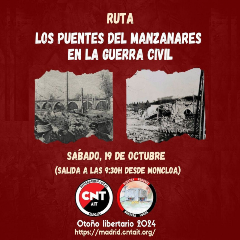 🍂 Otoño Libertario 🍂 Sábado, 19 de octubre (a las 9:30h) LOS PUENTES DEL MANZANARES EN LA GUERRA CIVIL Comenzará en el Intercambiador de Moncloa (Salida al Paseo Moret) a las 9:30h,… Sigue leyendo...