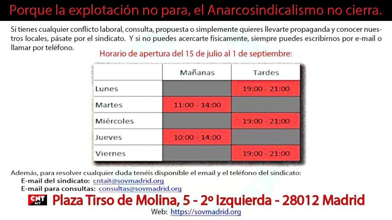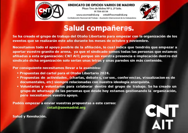 Se sigue solicitando ayuda a tod@s l@s militantes y a los sindicatos de la confederación y a las secciones internacionales integradas en la AIT para cumplir este objetivo, y ha habido respuesta estos últimos meses por medio de acciones desde la sección Bristol Solfed (Inglaterra), CNT-AIT Francia y Anarcho-Syndicalisten München (Alemania), al igual que por parte de sindicatos de CNT-AIT ...