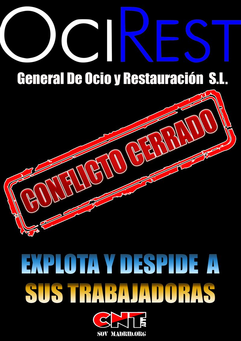 El SOV CNT de Madrid da por finalizado el conflicto que mantenía con la empresa de hostelería Ocirest al haber llegado a un acuerdo con la empresa de pago de las cantidades…Sigue leyendo...