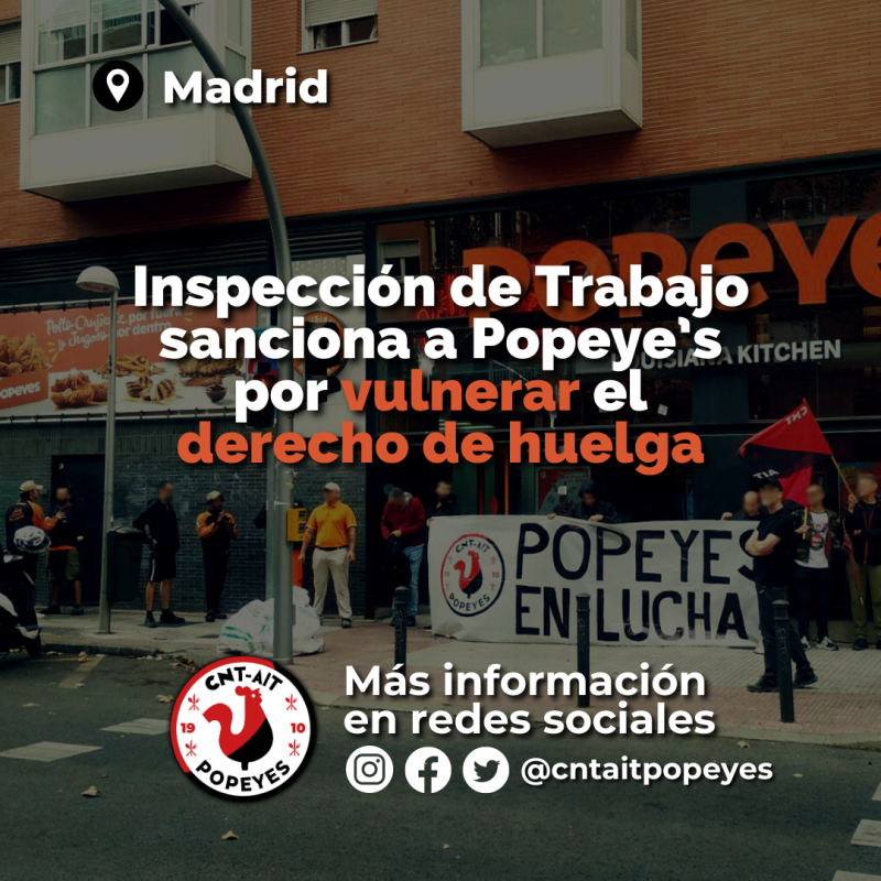 Inspección de Trabajo da la razón a la sección de CNT-AIT en Popeye’s y sanciona a la empresa por vulnerar el derecho a huelga
