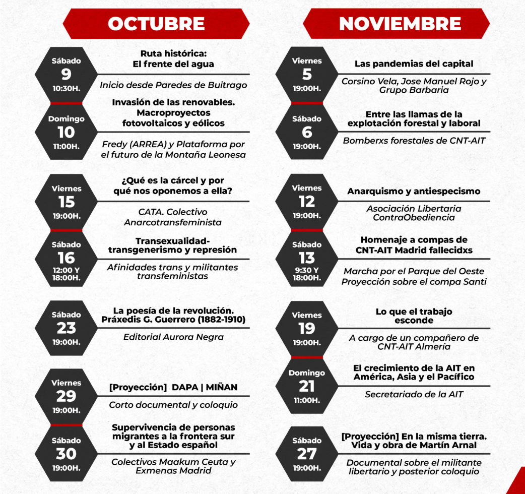Se acerca el final del verano y con ello damos paso al Otoño Libertario, un evento que año tras año se esfuerza por proponer debates y dar visibilidad a luchas actuales y pasadas. Este año, el contenido del Otoño Libertario es especialmente diverso, tanto en temáticas como en territorios. Memoria histórica, defensa de la naturaleza, cárceles, represión, transfobia, literatura, migración, pandemias, incendios forestales, antiespecismo y liberación animal, anarcosindicalismo e internacionalismo…